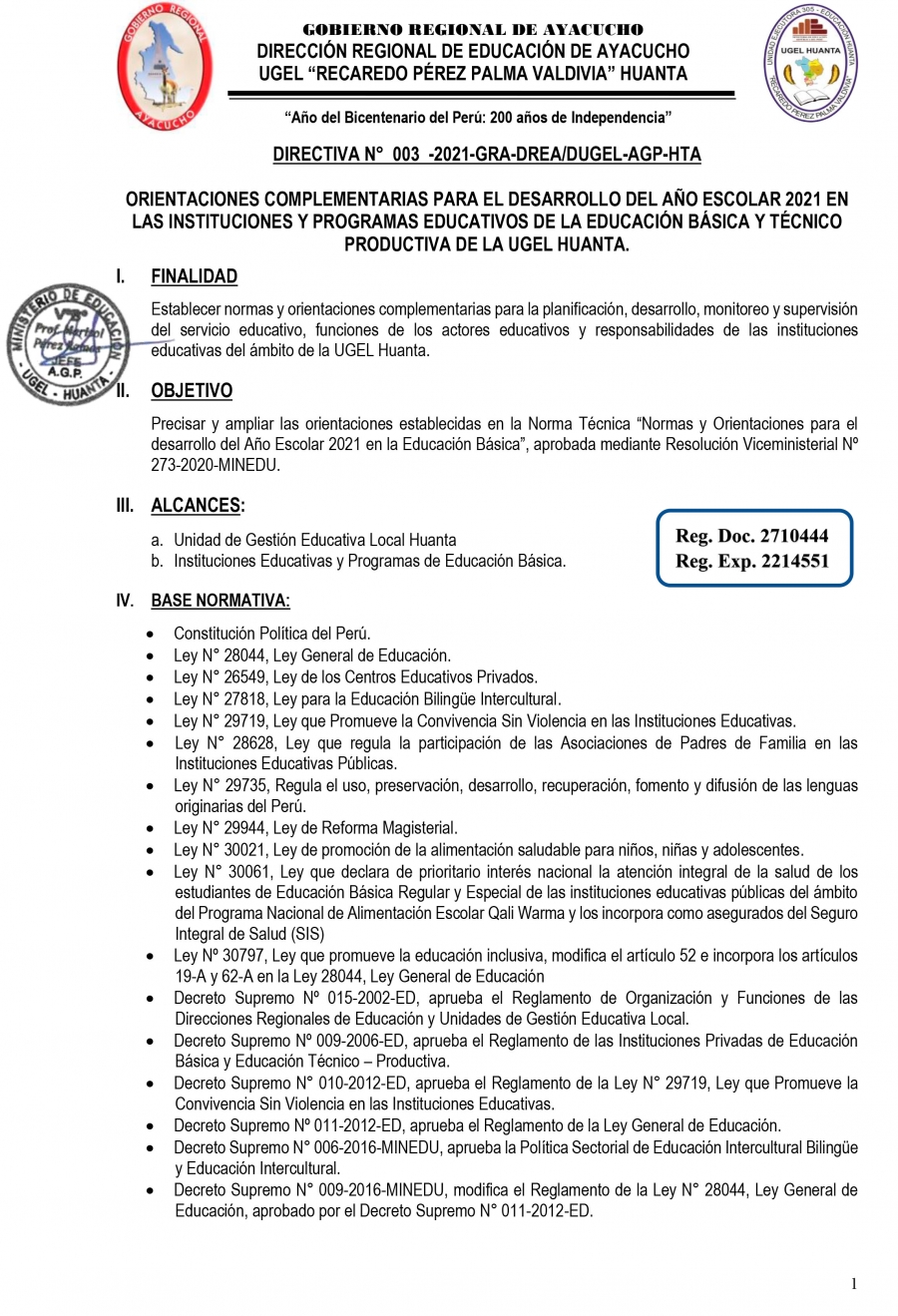 ORIENTACIONES COMPLEMENTARIAS PARA EL DESARROLLO DEL AÑO ESCOLAR 2021 EN LAS INSTITUCIONES Y PROGRAMAS EDUCATIVOS DE LA EDUCACIÓN BÁSICA Y TÉCNICO PRODUCTIVA DE LA UGEL HUANTA.